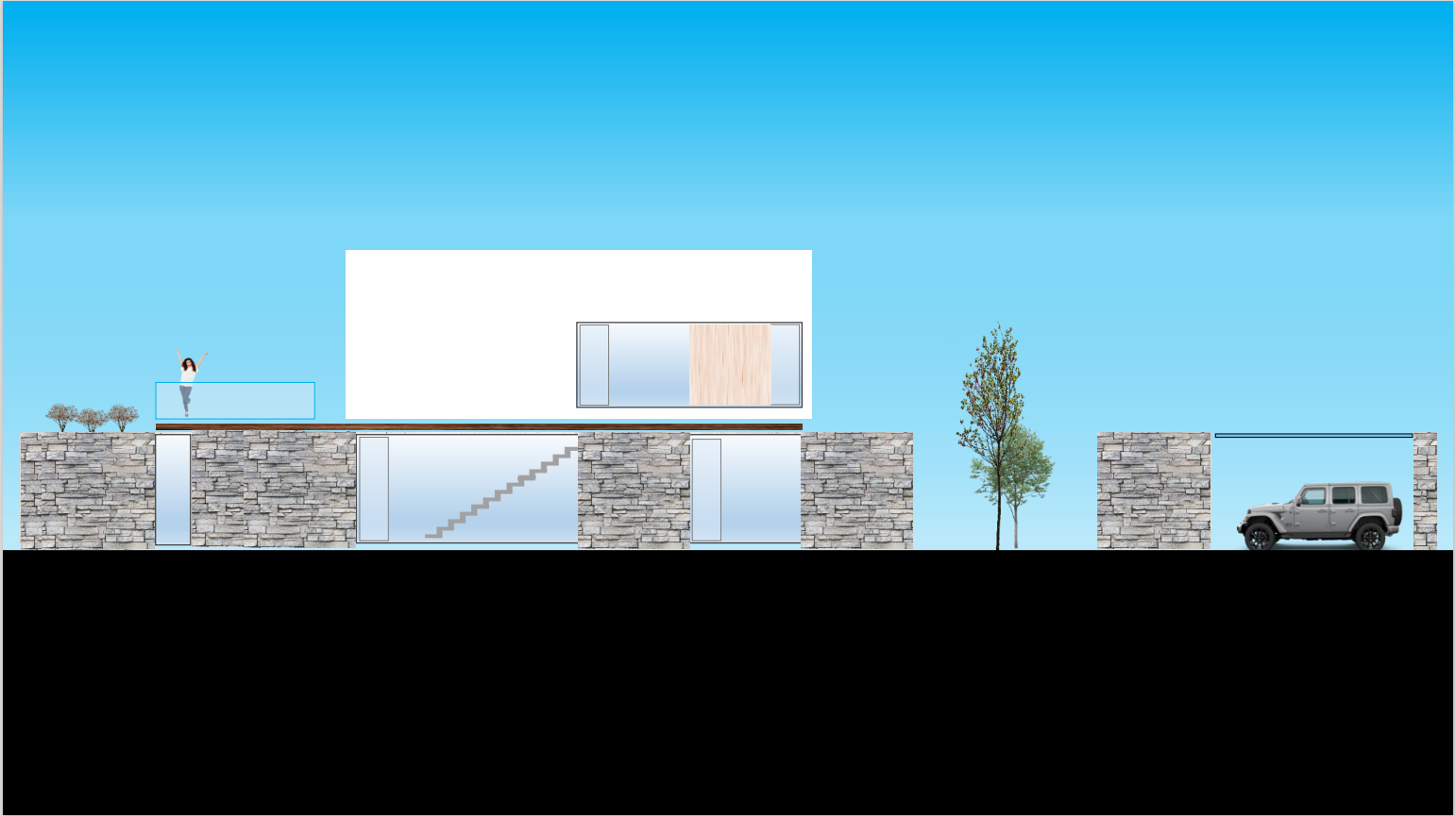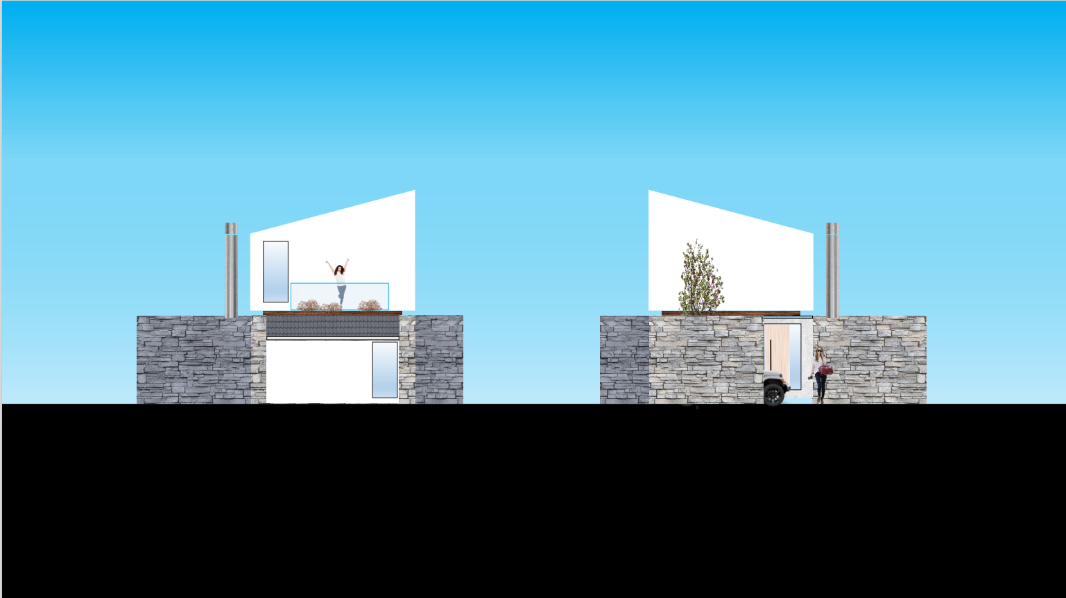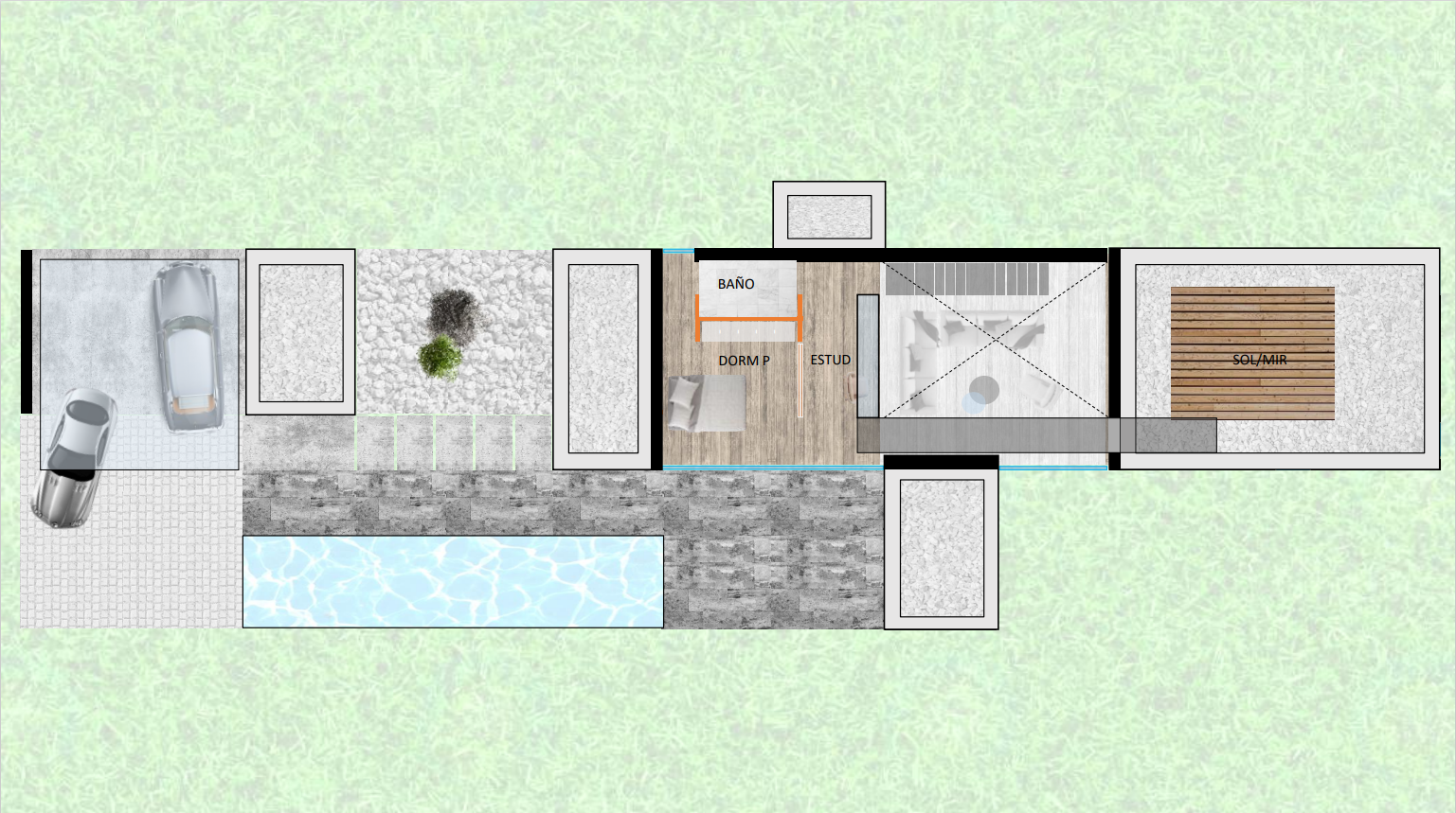 Cada pieza del planteamiento se identifica con su textura y se cosen con el vidrio que nos comunica con el paisaje y el exterior. Se enfatiza esta relación con recorridos funcionales, como la pasarela al solarium sobre la zona de estar, creando atmósferas de mayor sensibilidad y ternura.
